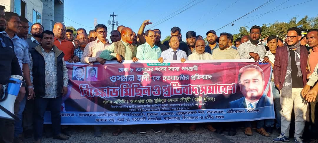 ওসমান হাদীর হত্যাচেষ্টার প্রতিবাদে কমলগঞ্জে বিএনপির বিক্ষোভ মিছিল ও প্রতিবাদ সমাবেশ