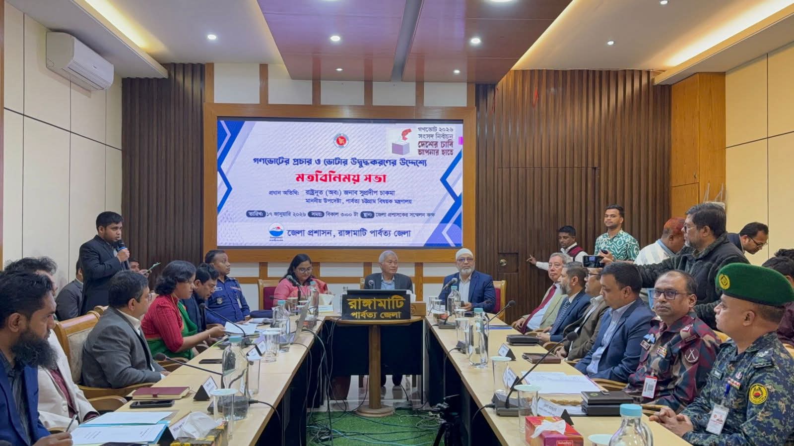 রাঙামাটিতে ‘গণভোট ২০২৬’ সফল করতে এবং ভোটারদের উদ্বুদ্ধ করতে এক বিশেষ মতবিনিময় সভা অনুষ্ঠিত হয়েছে। শনিবার (১৭ জানুয়ারি) বিকেলে রাঙামাটি জেলা প্রশাসক সম্মেলন কক্ষে আয়োজিত এই সভায় প্রধান অতিথি হিসেবে উপস্থিত ছিলেন পার্বত্য চট্টগ্রাম বিষয়ক মন্ত্রণালয়ের উপদেষ্টা রাষ্ট্রদূত (অব.) সুপ্রদীপ চাকমা।প্রধান অতিথির বক্তব্যে উপদেষ্টা সুপ্রদীপ চাকমা বলেন, দেশের চাবি এখন জনগণের হাতে।