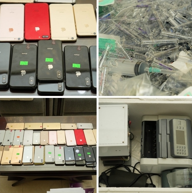​জব্দকৃত মালামালের তালিকায় রয়েছে ৪৫টি আইফোন, বিভিন্ন ব্র্যান্ডের ৩১টি অ্যান্ড্রয়েড ফোন, ১০টি মোবাইল ডিসপ্লে, ১টি ল্যাপটপ এবং মোবাইল মেরামতের বিভিন্ন আধুনিক সরঞ্জাম যেমন চেকারবোর্ড, ব্যাটারি বুস্টার, টুলবক্স ও কেসিং। এছাড়া ঘটনাস্থল থেকে দুই কার্টুন ইনজেকশন সিরিঞ্জ এবং একটি টাকা গণনার মেশিনও উদ্ধার করা হয়।