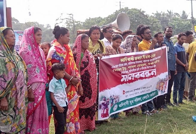 মনিরুল ইসলাম, নাটোর জেলা প্রতিনিধিনাটোরের বড়াইগ্রামে যথাযোগ্য মর্যাদায় পালিত হয়েছে আদিবাসী হত্যা দিবস। বৃহস্পতিবার বেলা ১১টার দিকে উপজেলার বনপাড়া বাইপাস চত্বরে মানববন্ধন কর্মসূচির আয়োজন করে কেন্দ্রীয় আদিবাসী যুব পরিষদ।২০১৬ সালের ৬ নভেম্বর গাইবান্ধার গোবিন্দগঞ্জের সাহেবগঞ্জ-বাগদাফার্ম এলাকায় পুলিশের গুলিতে তিনজন সাঁওতাল আদিবাসী নিহত হওয়ার ঘটনার প্রতিবাদে প্রতিবছর এ দিবসটি পালন করা হয়।মানববন্ধনে উপস্থিত ছিলেন সংগঠনটির কেন্দ্রীয় সভাপতি যাদু কুমার দাস, কেন্দ্রীয় উপদেষ্টা মুন্ডা কালিদাস রায়, জাতীয় আদিবাসী পরিষদ নাটোর জেলা শাখার সভাপতি নরেশ চন্দ্র উঁরাও, সাধারণ সম্পাদক প্রদীপ লাকড়া, কেন্দ্রীয় সদস্য বুদুরাম মাল পাহাড়িয়া, কেন্দ্রীয় সাধারণ সম্পাদক শ্যামলাল তেলী, বড়াইগ্রাম উপজেলা আহ্বায়ক উত্তম কুমার দাস, জাতীয় আদিবাসী পরিষদ নাটোর সদর উপজেলা আহ্বায়ক বাবুল পাহান, বড়াইগ্রাম উপজেলা সাধারণ সম্পাদক মোহন বাগদী, সদস্য দিপংকর এক্কা প্রমুখ।বক্তারা বলেন, সাহেবগঞ্জ-বাগদাফার্মে তিন সাঁওতালকে গুলি করে হত্যার বিচার আজও হয়নি। এই হত্যার দায় রাষ্ট্রের, আর আদিবাসীদের ভূমি রক্ষা ও জীবনের নিরাপত্তা নিশ্চিত করাও রাষ্ট্রের দায়িত্ব।তারা আরও বলেন, আদিবাসীদের সাংবিধানিক স্বীকৃতি দিতে হবে, পৃথক ভূমি কমিশন ও মন্ত্রণালয় গঠন করতে হবে। ন্যায়বিচার ও অধিকার নিশ্চিত না হলে আন্দোলন আরও বেগবান করা হবে বলে হুঁশিয়ারি দেন নেতারা।উল্লেখ্য, ২০১৬ সালের এই দিনে পুলিশের গুলিতে নিহত হন সাঁওতাল জাতিগোষ্ঠীর তিনজন সদস্য। তাদের স্মরণে প্রতি বছর ৬ নভেম্বর দিনটি ‘আদিবাসী হত্যা দিবস’ হিসেবে পালন করে আসছে বিভিন্ন আদিবাসী সংগঠন।