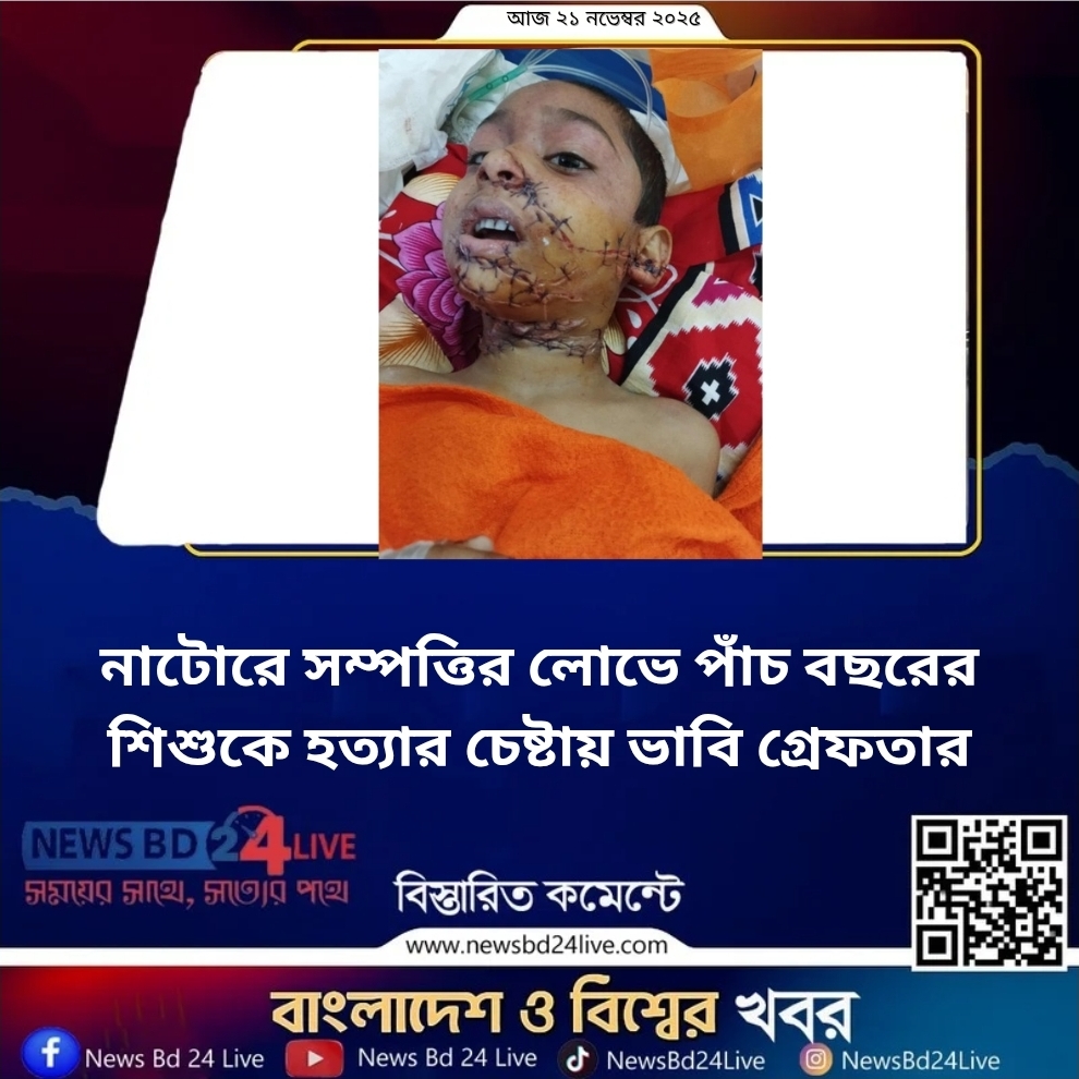 নাটোরের নলডাঙ্গা উপজেলায় সম্পত্তির লোভ ও পারিবারিক ক্ষোভের জেরে পাঁচ বছরের এক শিশুকে নৃশংসভাবে হত্যার চেষ্টা করার অভিযোগে জেমি খাতুন (১৯) নামের এক ভাবিকে গ্রেফতার করেছে পুলিশ। সোমবার (১৭ নভেম্বর ২০২৫) নলডাঙ্গার খাজুরা ইউনিয়নের সাধনগর (উত্তরপাড়া) গ্রামে এ ঘটনা ঘটে।পুলিশ ও স্থানীয় সূত্রে জানা যায়, ভিকটিম শিশুটির বড় ভাইয়ের সঙ্গে চার মাস আগে প্রেমের সম্পর্কের পর বিয়ে হয় জেমি খাতুনের।
