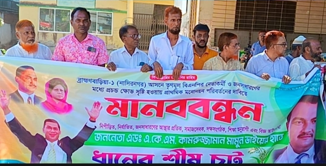 ব্রাহ্মণবাড়িয়ার-০১ নাসিরনগরে আসনের বিএনপির মনোনয়ন পুনর্বিবেচনার দাবিতে মানববন্ধন ও বিক্ষোভ করেছে এডভোকেট কামরুজ্জামান মামুনের সমর্থকরা।বুধবার (১৯ নভেম্বর) সকাল ১১ টা থেকে দুপুর ১ টা পর্যন্ত নাসিরনগর উপজেলা শহীদ মিনার, কোর্ট রোড, কুন্ডা, ফান্দাউক সহ পৃথকভাবে এ মানববন্ধন কর্মসূচি অনুষ্ঠিত হয়।গত (৩ নভেম্বর) ব্রাহ্মণবাড়িয়া- ১নাসিরনগর আসনে বিএনপির থেকে প্রাথমিক মনোনয়ন পান নাসিরনগর উপজেলা বিএনপির সভাপতি এমএ হান্নান।