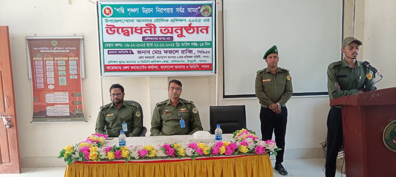 মানিকনগর আনসার ও ভিডিপি প্রশিক্ষণ কেন্দ্র ঈশ্বরদী, পাবনাতে উপজেলা/থানা কোম্পানী/প্লাটুন আনসার সদস্যদের মৌলিক প্রশিক্ষণ ৭ম ধাপ এর ইংরেজী ০৯/১২/২০২৫ খ্রিষ্টাব্দ হতে ২২/১২/২০২৫ খ্রিষ্টাব্দ পর্যন্ত ১৪ দিন মেয়াদি প্রশিক্ষণের জনবল প্রাধিকার- ১২৮ জন। যোগদান- ১২৮ জন। অদ্য হাজির- ১২৮ জন। অদ্যকার দুপুর ১২:০০ ঘটিকায় পাবনা জেলার ০৯টি উপজেলার, উপজেলা/থানা কোম্পানী/প্লাটুন আনসার সদস্যদের মৌলিক প্রশিক্ষণ ৭ম ধাপ এর উদ্বোধনী অনুষ্ঠান জনাব মো: ফজলে রাব্বি পিভিএম জেলা কমান্ড্যান্ট, পাবনা (প্রশিক্ষণের শিবির অধিনায়ক) উদ্বোধন করেন মানিকনগর আনসার ও ভিডিপি প্রশিক্ষণ কেন্দ্র ঈশ্বরদী, পাবনাতে অনুষ্ঠিত হয়েছে।