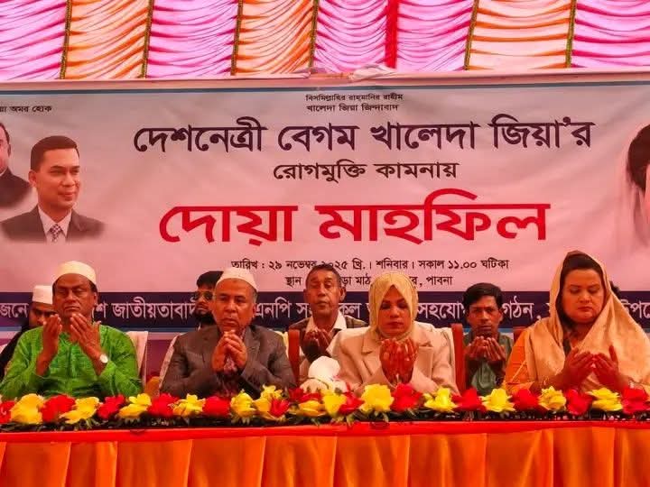 পাবনা জেলার ফরিদপুর উপজেলার বনওয়ারীনগর থানাপাড়া মাঠে ২৯ নভেম্বর ২০২৫ খ্রিঃ রোজ শনিবার সময়ঃ ১১.০০ ঘটিকায় দেশনেত্রী বেগম খালেদা জিয়ার রোগমুক্তির কামনায় দোয়া মাহফিল অনুষ্ঠিত হয়।উক্ত রোগমুক্তির কামনায় দোয়া মাহফিলে প্রধান অতিথিঃ পাবনা- ৩ বিএনপির মনোনীত প্রার্থী দেশবরেণ্য কৃষিবিদ হাসান জাফির তুহিন ও অত্র ফরিদপুর উপজেলার বিএনপি ও অঙ্গ সংগঠনের সকল নেতৃবৃন্দ রোগমুক্তির কামনায় দোয়া মাহফিলে উপস্থিত ছিলেন।