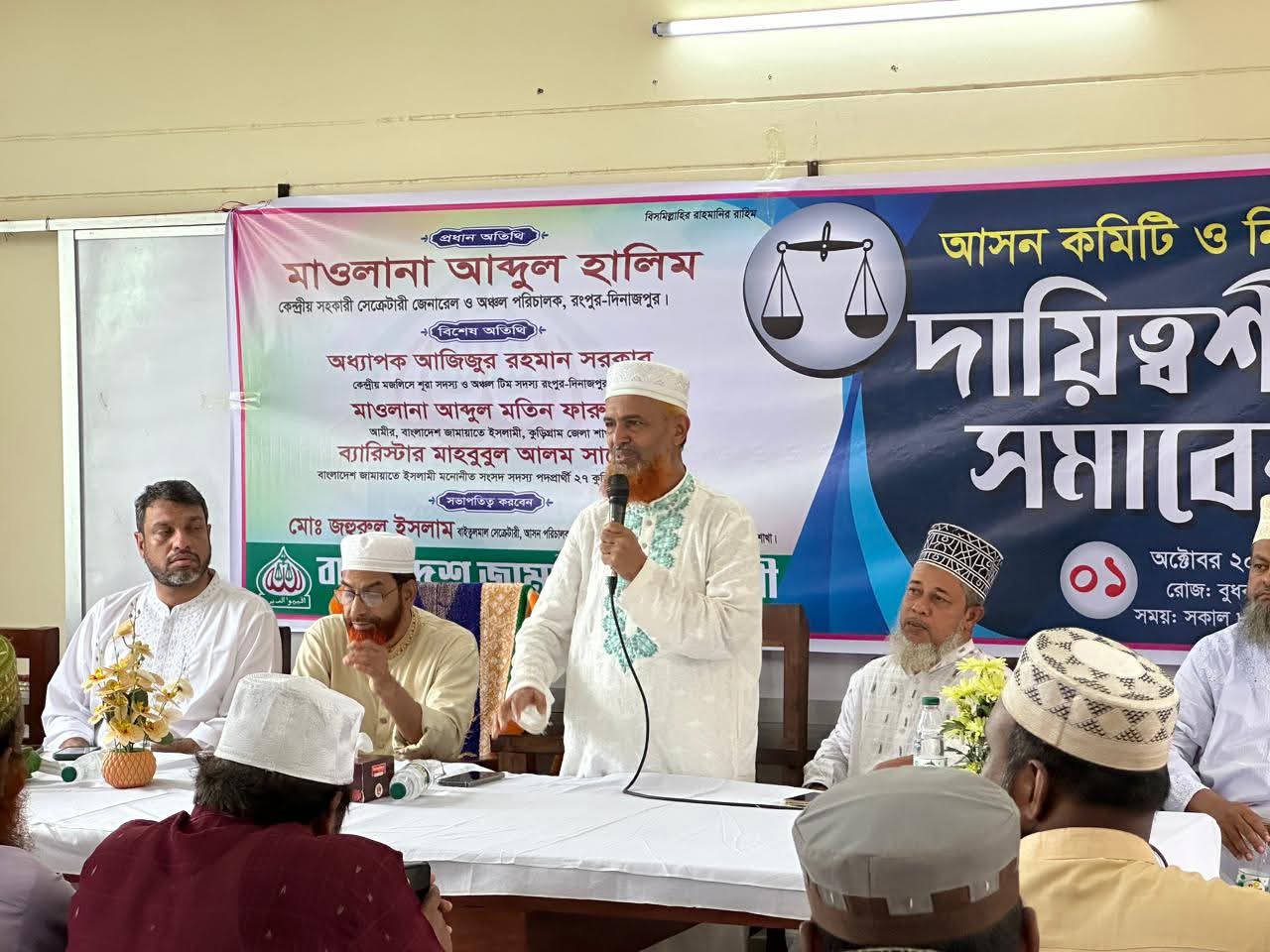 বাংলাদেশ জামায়াতে ইসলামী’র সহকারী সেক্রেটারি জেনারেল মাওলানা আবদুল হালিম বলেছেন, জামায়াতের নেতৃবৃন্দ ও কর্মীদের ত্যাগ-কুরবানিই দেশের জমিনকে ইসলামের জন্য উর্বর করেছে। তিনি আরও বলেন, ইসলামী আন্দোলনের অগ্রযাত্রা কোনো নির্যাতন, জেল, জুলুম বা ফাঁসি এবং গুমের মাধ্যমে থেমে যায়নি এবং ভবিষ্যতেও থেমে যাবে না।উলিপুর উপজেলা শাখার উদ্যোগে উলিপুর মতিন কারিগরি কলেজ হল রুমে অনুষ্ঠিত আসন কমিটি ও নির্বাচনী সমাবেশে প্রধান অতিথির বক্তব্যে তিনি এসব কথা বলেন। মাওলানা আবদুল হালিম নির্বাচনের প্রক্রিয়া নিয়ে মন্তব্য করে বলেন, ভবিষ্যতে নির্বাচনের পদ্ধতি অবশ্যই প্রজাতান্ত্রিক পদ্ধতিতে বা প্রোপশনাল রিপ্রেজেন্টেশন (PR) পদ্ধতিতে অনুষ্ঠিত হওয়া উচিত, যা ফ্যাসিবাদী ব্যবস্থার বিলোপ এবং প্রত্যেক নাগরিকের ভোটের মূল্যায়ন নিশ্চিত করবে।সমাবেশে কুড়িগ্রাম জেলা জামায়াতে ইসলামীর কর্মপরিষদ সদস্য ও আসন পরিচালক মোঃ জহুরুল ইসলামের সভাপতিত্বে উপস্থিত ছিলেন কেন্দ্রীয় মজলিসে শূরা সদস্য অধ্যাপক আজিজুর রহমান সরকার, কুড়িগ্রাম জেলা আমীর মাওলানা আব্দুল মতিন ফারুকী, কুড়িগ্রাম-৩ আসনের সংসদ সদস্য পদপ্রার্থী ব্যারিস্টার মাহবুবুল আলম সালেহ, জেলা সেক্রেটারি নিজাম উদ্দিন, জেলা সহকারী সেক্রেটারি অধ্যক্ষ শাহজালাল সবুজ এবং উলিপুর উপজেলার ভারপ্রাপ্ত আমীর এডভোকেট কামাল কবির লিটন।উল্লেখ্য, একই দিনে বেলা ৩টায় কুড়িগ্রাম-৪ আসনের রৌমারী, রাজিবপুর ও চিলমারী উপজেলা শাখার উদ্যোগে পৃথক আসন কমিটি ও নির্বাচনী সমাবেশে মাওলানা আবদুল হালিম প্রধান অতিথি হিসেবে উপস্থিত ছিলেন। এতে সভাপতিত্ব করেন চিলমারী উপজেলা আমীর ও আসন পরিচালক অধ্যাপক নূর আলম মুকুল। উপস্থিত ছিলেন কুড়িগ্রাম-৪ আসনের সংসদ সদস্য পদপ্রার্থী মোঃ মোস্তাফিজুর রহমান।