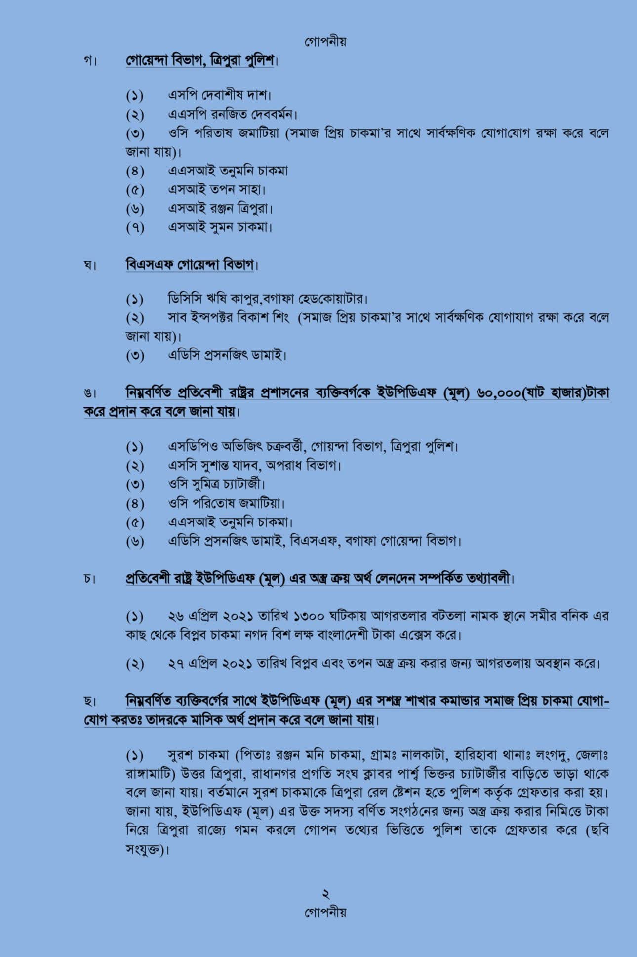 পার্বত্য চট্টগ্রাম ভিত্তিক আঞ্চলিক দল ইউনাইটেড পিপলস ডেমোক্রেটিক ফ্রন্ট (ইউপিডিএফ)–এর কার্যকলাপ নিয়ে নতুন করে নড়েচড়ে বসেছে আইন-শৃঙ্খলা রক্ষাকারী বাহিনী। সম্প্রতি ফাঁস হওয়া একাধিক গোপনীয় গোয়েন্দা রিপোর্টে উঠে এসেছে সংগঠনটির ভারতীয় রাজ্য ত্রিপুরা সীমান্তজুড়ে নাশকতা, গোপন বৈঠক এবং অর্থ লেনদেনের বিস্তারিত তথ্য।ত্রিপুরা পুলিশের বিভিন্ন শাখা, ভারতের নিরাপত্তা সংস্থা এবং স্থানীয় প্রশাসনের যৌথ প্রতিবেদনে বলা হয়েছে, ইউপিডিএফ–এর সক্রিয় সদস্যরা শুধু বাংলাদেশেই নয়, ভারতীয় ভূখণ্ডেও গোপনে আস্তানা গড়ে তুলেছে। এমনকি সীমান্তবর্তী গ্রামগুলোতে কিছু প্রভাবশালী পরিবার তাদের আশ্রয়-প্রশ্রয় দিচ্ছে বলে তথ্য রয়েছে।গোয়েন্দা তথ্যের মূল দিকগুলো:আগরতলা, সোনামুড়া ও বিভিন্ন সীমান্তবর্তী থানায় ইউপিডিএফ সদস্যদের চলাচল শনাক্ত।একাধিক এসপি ও ডিএসপি পর্যায়ের কর্মকর্তাদের নামে রিপোর্টে উল্লেখ রয়েছে, যারা পরিস্থিতি পর্যবেক্ষণ করছেন।নাশকতা, অর্থ লেনদেন ও সীমান্ত দিয়ে অবৈধ যাতায়াতের ঘটনাগুলো গোয়েন্দা ডসিয়ারে সংরক্ষিত।নিহত নেতা সুরেশ চাকমার পরিবারের সদস্যদের মাধ্যমে সংগঠনটির অর্থায়ন ও সাংগঠনিক যোগাযোগের প্রমাণ।ভারতীয় মাটিতে বসেই বাংলাদেশি সীমান্ত এলাকায় নতুন কর্মী নিয়োগ ও চাঁদা আদায়ের কার্যক্রম।সূত্র জানায়, সম্প্রতি ২৬ ও ২৭ এপ্রিল ২০২১ তারিখে আগরতলায় সংঘটিত বৈঠকের তথ্য হাতে পেয়েছে গোয়েন্দারা। বৈঠকে উপস্থিতদের নাম-পরিচয় ও তৎপরতা উল্লেখ করা হয়েছে রিপোর্টে।এছাড়া, ইউপিডিএফের সক্রিয় নেতা বিনয় চাকমা ও সুরেশ চাকমার পরিবারের সদস্যরা ভারতীয় ত্রিপুরা রাজ্যে অবস্থান করে সংগঠনটির জন্য অর্থ সংগ্রহ করছে বলে জানিয়েছে প্রশাসন। সীমান্তবর্তী এলাকায় সাধারণ মানুষের মাঝে আতঙ্ক বিরাজ করছে।স্থানীয় সূত্রে জানা যায়, ইউপিডিএফের এই কার্যকলাপ শুধু আঞ্চলিক শান্তি-শৃঙ্খলাই নয়, বরং ভারত–বাংলাদেশ দুই দেশের নিরাপত্তার জন্যও হুমকি হয়ে উঠছে।