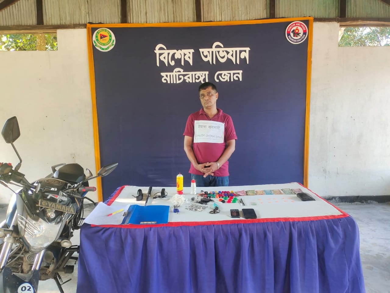 আটককৃত ব্যক্তী, মাটিরাঙ্গা উপজেলাধীন তাইন্দং ইউনিয়নের উত্তর বরবিল এলাকার আব্দুর রাজ্জাক এর ছেলে ইসমাইল হোসেন সিরাজী (৫০)।উদ্ধারকৃত সরঞ্জামঃ ইয়াবা-৫৩ পিস, গ্যাস লাইট-২১ টি, নগদ টাকা -৪৭৬০/=, ইয়াবা কন্ট্রোলার-১৮ পিস, ড্রাইভিং লাইসেন্স -০১টি, গ্যাস লাইটার ফিলিং বোতল-০১ টি, মোবাইল ফোন-০২টি ( এ্যান্ড্রয়েড -০১, বাটন-০১), মোবাইল চার্জার-০১ টি, মানি ব্যাক-০১টি, স্টাম স্টিক-০১টি, মোটরসাইকেল এফজেড(ভার্সন-২)-০১ টি, সিজার-০১ টি, বাতি-০১টি।
