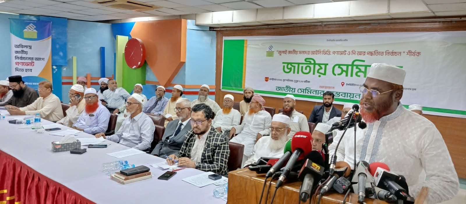 জুলাই জাতীয় সনদের আইনি ভিত্তি: গণভোট ও পিআর পদ্ধতিতে নির্বাচন’ শীর্ষক জাতীয় সেমিনার বৃহস্পতিবার (১৬ অক্টোবর) বিকেলে রাজধানীর ইনস্টিটিউশন অব ডিপ্লোমা ইঞ্জিনিয়ার্স মিলনায়তনে অনুষ্ঠিত হয়েছে।সেমিনারে সভাপতিত্ব করেন বাংলাদেশ ইসলামিক ইউনিভার্সিটির সাবেক উপাচার্য প্রফেসর মো. কোরবান আলী। মূল প্রবন্ধ উপস্থাপন করেন সুপ্রিম কোর্টের সিনিয়র আইনজীবী ব্যারিস্টার মুহাম্মদ বেলায়েত হোসেন।সেমিনারে অংশ নেন বিভিন্ন রাজনৈতিক দলের জাতীয় নেতৃবৃন্দ, সাবেক সচিব, সাবেক ভিসি, সাংবাদিক, পেশাজীবী সংগঠনের প্রতিনিধি ও শিক্ষাবিদরা। বক্তারা জুলাই জাতীয় সনদে পিআর (Proportional Representation) পদ্ধতি অন্তর্ভুক্ত করে নভেম্বরের মধ্যেই গণভোট সম্পন্ন করার দাবি জানান।সভা পরিচালনা করেন বাংলাদেশ জামায়াতে ইসলামীর সহকারী সেক্রেটারি জেনারেল মাওলানা আবদুল হালিম।এতে বক্তব্য রাখেন খেলাফত মজলিসের মহাসচিব ড. আহমদ আবদুল কাদের, খেলাফত আন্দোলনের নায়েবে আমীর মাওলানা মুজিবুর রহমান হামিদী, ইসলামী আন্দোলন বাংলাদেশের প্রেসিডিয়াম সদস্য অধ্যাপক আশরাফ আলী আকন্দ, মুফতি ফখরুল ইসলাম, সাবেক ভিসি ড. আবদুল লতিফ মাছুম, অধ্যাপক ড. ফখরুল ইসলাম, সাংবাদিক মাসুমুর রহমান খলিলী, অধ্যাপক ডা. নজরুল ইসলাম, এডভোকেট শেখ আতিয়ার রহমান, ব্রিগেডিয়ার (অব.) মাহমুদুল হাসান, প্রফেসর কাজী মিনহাজুল রহমান, প্রফেসর ডা. কর্ণেল (অব.) জেহাদ খান, ডিএসইউ সভাপতি শহিদুল ইসলাম এবং সাবেক সচিব ড. জাহেদুল ইসলাম প্রমুখ।বিচারপতি ফরিদ আহমেদের বক্তব্যপ্রধান অতিথি সাবেক বিচারপতি ফরিদ আহমেদ বলেন, জুলাই সনদের আইনি ভিত্তি দিতে ব্যর্থ হলে অন্তর্বর্তীকালীন সরকার ব্যর্থ হবে। তিনি পিআর পদ্ধতির গুরুত্ব তুলে ধরে বলেন, এই পদ্ধতিতে পারিবারিক প্রভাব, মনোনয়ন বাণিজ্য ও স্বৈরাচারের পথ রুদ্ধ হবে।মিয়া গোলাম পরওয়ারের বক্তব্যবাংলাদেশ জামায়াতে ইসলামীর সেক্রেটারি জেনারেল অধ্যাপক মিয়া গোলাম পরওয়ার বলেন,> “জাতীয় নির্বাচন ও গণভোট একই দিনে সম্ভব নয়। একজন ভোটার গণভোটের ব্যালট বুঝে ভোট দিতে সময় নেবে— ফলে অনেকেই ভোট দিতে পারবে না। তাই নভেম্বরের মধ্যেই গণভোট সম্পন্ন করতে হবে।”তিনি আরও বলেন,> “কিছু উপদেষ্টা একটি দলের এজেন্ডা বাস্তবায়নে কাজ করছে, যা অন্তর্বর্তীকালীন সরকারের নিরপেক্ষতা প্রশ্নবিদ্ধ করছে। প্রধান উপদেষ্টাকে এখনই সতর্ক হতে হবে।”মিয়া গোলাম পরওয়ার পিআর পদ্ধতির প্রশংসা করে বলেন, “যারা পিআর বোঝে না, তারা রাজনীতি বোঝে না। পড়তে না পারলে আমাদের কাছে আসুন, আমরা শেখাব।”অন্যান্য নেতাদের বক্তব্যইসলামী আন্দোলনের মহাসচিব মাওলানা ইউনুস আহমাদ বলেন, “জুলাই সনদের আইনি ভিত্তি না হলে এটি শহীদদের রক্তের প্রতি অবমাননা।”জামায়াতের সহকারী 