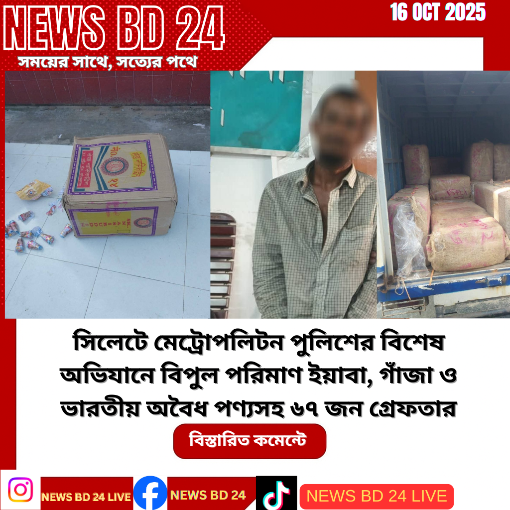 সিলেটে মেট্রোপলিটন পুলিশের বিশেষ অভিযানে বিপুল পরিমাণ ইয়াবা, গাঁজা ও ভারতীয় অবৈধ পণ্যসহ ৬৭ জন গ্রেফতার