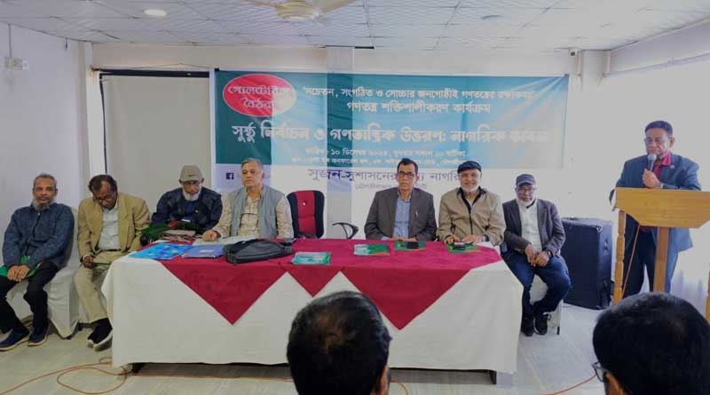 সুষ্ঠু নির্বাচন ও গণতান্ত্রিক উত্তরণে নাগরিক ভাবনা নিয়ে সুশাসনের জন্য নাগরিকের (সুজন) এর আয়োজনে গোলটেবিল বৈঠক অনুষ্ঠিত হয়েছে।বুধবার ১০ ডিসেম্বর সকালে মৌলভীবাজার শহরের একটি অভিজাত হোটেলের হল রুমে সুজনের এ বৈঠক অনুষ্ঠিত হয়। সুজন মৌলভীবাজার জেলা কমিটির সভাপতি ডা: ছাদিক আহমদ সভাপতিত্বে এবং সাধারণ সম্পাদক রুহেল আহমদ এর সঞ্চালনায় স্বাগত বক্তব্য রাখেন সুশাসনের জন্য নাগরিকের (সুজন) কেন্দ্রীয় সমন্বয়কারী দিলীপ কুমার সরকার।