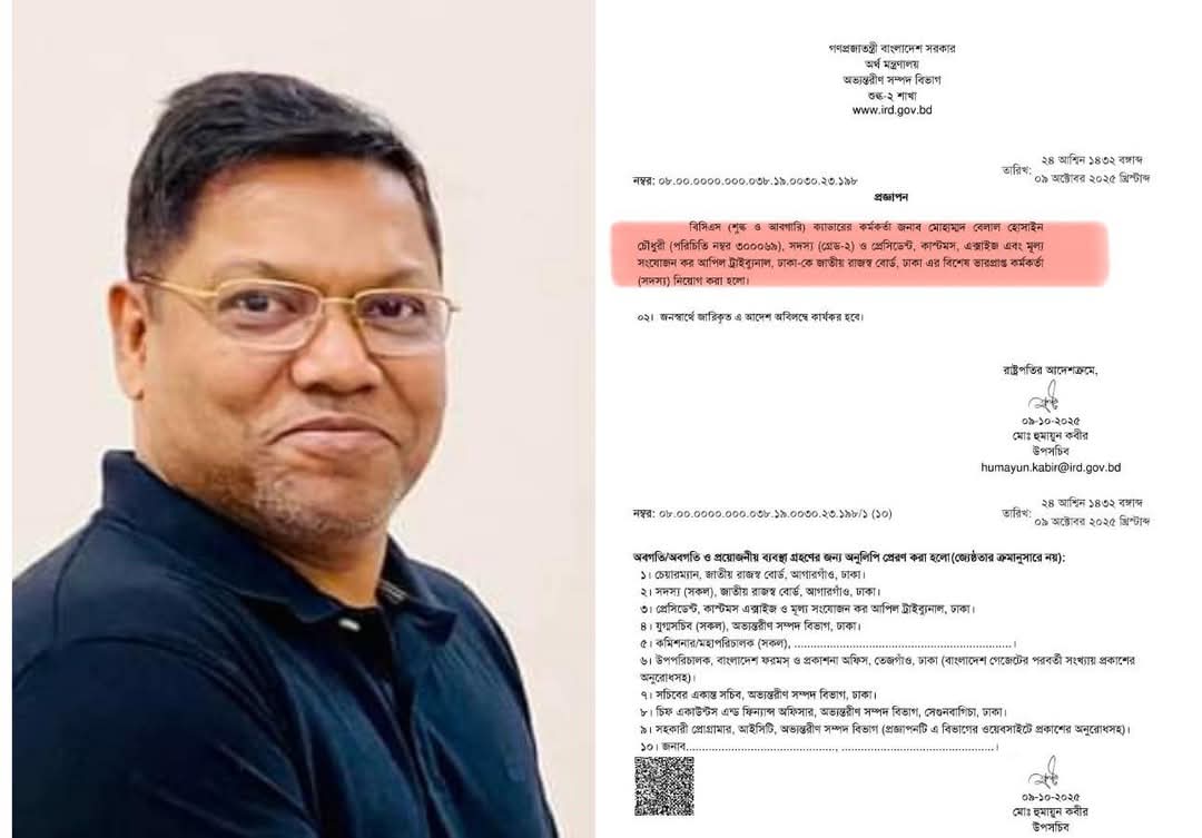 দুদক মামলার একদিন পর এনবিআর সদস্য মোহাম্মদ বেলাল হোসাইন চৌধুরীকে কাস্টমস, এক্সাইজ ও মূসক ট্রাইব্যুনালের প্রেসিডেন্ট পদে বদলি করা হয়। এবং আজই তাকে ওই দায়িত্বে বিশেষ ভারপ্রাপ্ত কর্মকর্তা (সদস্য) বা ওএসডি হিসেবে নিয়োগ দেওয়া হয়েছে। সাধারণ আচরণবিধি অনুযায়ী যদি যেকোনো কর্মকর্তা দুর্নীতি বা অবৈধ সম্পদ অভিযোগের মুখে পড়ে, তখন তাঁকে সাময়িক বরখাস্ত বা তাকে দায়িত্ব থেকে সরিয়ে রাখা হয়। তাহলে কেন বেলালকে কেবল ওএসডি করা হলো — সেই কারণ ও সম্ভাব্য উদ্দেশ্য বিশ্লেষণ করেই নিচের প্রতিবেদনে তুলে ধরা হলো।মামলা ও বদলির পটভূমিগত ৭ অক্টোবর, দুর্নীতি দমন কমিশন (দুদক) জ্ঞাত আয়ের উৎসের বাইরে প্রায় ৪ কোটি ৬০ লাখ টাকার সম্পদ অর্জন ও সম্পদের তথ্য গোপনের অভিযোগে বেলালের বিরুদ্ধে মামলা দায়ের করে। মামলায় বলা হয়েছে, তিনি দাখিল করেছেন ৮ কোটি ৮৩ লাখ টাকার সম্পদের তথ্য, কিন্তু অনুসন্ধানে পাওয়া যায় ১৩ কোটি ৪৩ লাখ টাকার সম্পদ। অর্থাৎ প্রায় ৪ কোটি ৬০ লাখ টাকার সম্পদ তিনি তথ্য গোপন করেছেন বলে অভিযোগ করা হয়েছে। মামলার পর ৮ অক্টোবর, প্রজ্ঞাপনে তাকে কাস্টমস, এক্সাইজ ও মূসক ট্রাইব্যুনালে তার নতুন দায়িত্ব দেওয়ার নির্দেশ দেওয়া হয়। এরপর আজ (৯ অক্টোবর) তিনি ওই মোড়ক অধীন ওএসডি পদে নিয়োজিত হয়েছেন — অর্থাৎ কার্যকরভাবে তাঁকে সরাসরি তার দায়িত্বে নিয়োগ দেওয়া হয়নি।সাধারণ প্রক্রিয়া ও ব্যতিক্রমধারণাগতভাবে, এমন অভিযোগ ওঠার সঙ্গে সঙ্গে একটি দায়িত্বশীল কর্মকর্তা সাময়িক বরখাস্ত করা হয় যাতে তিনি তদন্তে কোনো প্রভাব ফেলতে না পারে। কারণ অভিযোগ ও মামলা চলাকালীন সময়ে সংশ্লিষ্ট ব্যক্তি দায়িত্বে থাকলে প্রমাণাদি সংরক্ষনে জটিলতা, সাক্ষী প্রভাবিত হওয়া বা সরকারি তথ্য-দূষণ ইত্যাদি ঝুঁকি থাকে।কিন্তু এখানে বরখাস্ত না করে কেবল ওএসডি করার পেছনে কিছু সম্ভাব্য কারণ ও লক্ষ্য থাকতে পারে — যা নীচে বিশ্লেষণ করা হলো:সম্ভাব্য কারণ ও উদ্দেশ্য1. যেকোনো আইনগত চ্যালেঞ্জ এড়ানোসরাসরি বরখাস্ত করলে সংশ্লিষ্ট ব্যক্তি ন্যায়বিচার বিচ্যুতির অভিযোগ আনে তার সুযোগ থাকতে পারে। ওএসডি রাখা হলে “দায়িত্বে নেই কিন্তু প্রাপ্য মর্যাদা রক্ষা” করার যুক্তি দেওয়া যেতে পারে।2. প্রভাব বিস্তার অব্যাহত রাখাওএসডি থাকলে ব্যক্তি প্রশাসনিক নিয়ন্ত্রণ ও যোগাযোগ রূপে আবদ্ধ থাকতে পারে—অর্থাৎ তিনি সরকারি লাইসেন্স অনুযায়ী প্রশাসনিক ও নেটওয়ার্কে প্রভাব রাখতে পারেন।3. গ্রেপ্তার রোধের প্রয়াসযদি একে পুরোপুরি বরখাস্ত করা হতো, তখন গ্রেপ্তার বা নিয়ন্ত্রণ করা সহজ হতো। ওএসডি করে রেখে “কাজ চলছে” বা “অস্থায়ী” এই ছলাভ্যাস দেওয়া যেতে পারে, এবং আইন প্রক্রিয়াকে বিলম্বিত করা যেতে পারে।4. ক্ষমতা প্রদর্শন 