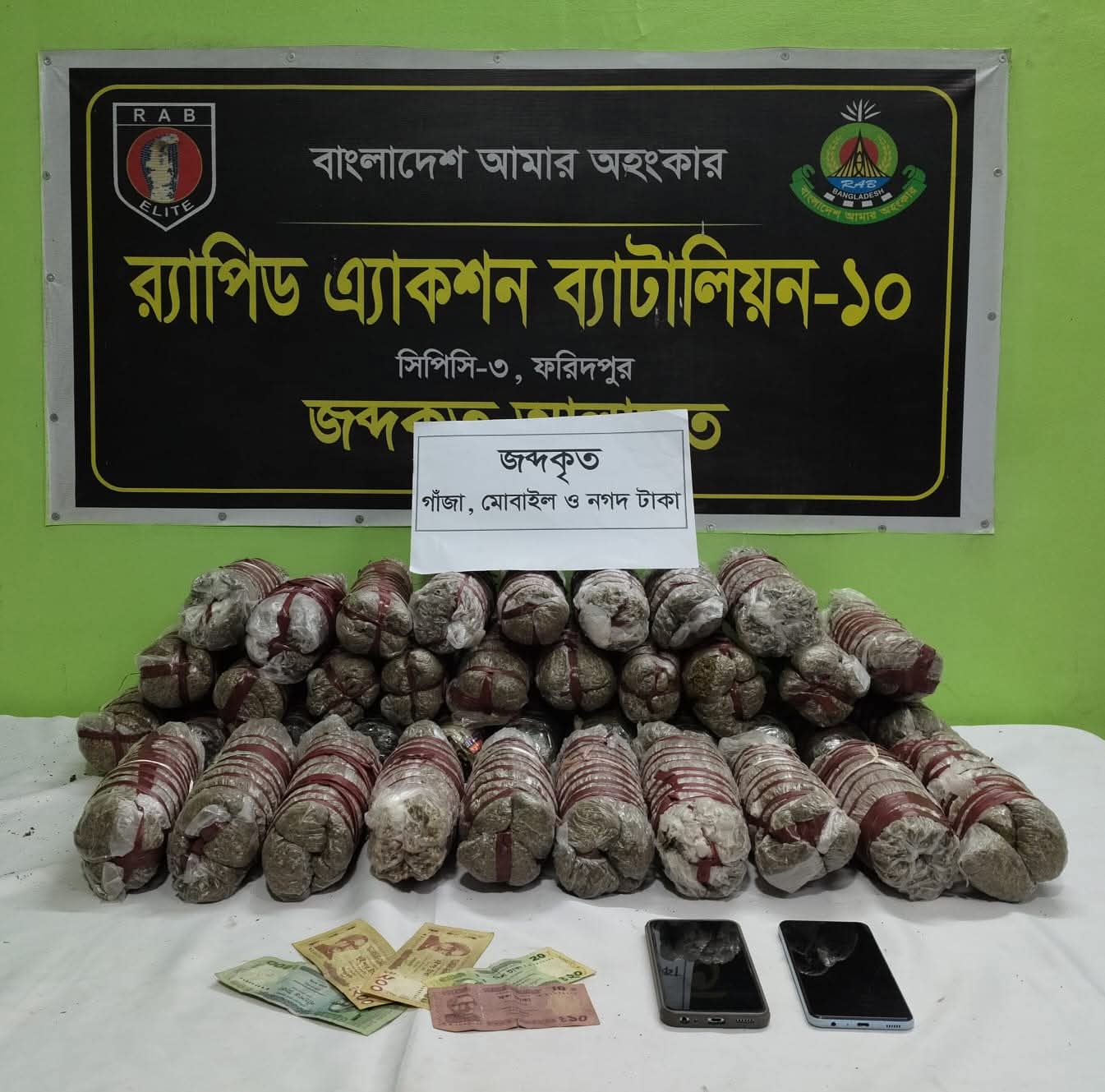 র‍্যাপিড অ্যাকশন ব্যাটালিয়ন (র‍্যাব)–১০ এর একটি বিশেষ অভিযানে ফরিদপুর থেকে আনুমানিক ৬ লক্ষ ৩৩ হাজার টাকা মূল্যমানের ২১ কেজি ১০০ গ্রাম গাঁজাসহ দুইজন মাদক ব্যবসায়ীকে গ্রেফতার করা হয়েছে।র‍্যাব জানায়, দেশের তরুণ সমাজকে মাদকদ্রব্যের ভয়াল থাবা থেকে রক্ষার লক্ষ্যে নিয়মিত অভিযানের অংশ হিসেবে বুধবার (১৫ অক্টোবর) রাত আনুমানিক ১২টা ৩০ মিনিটে ফরিদপুর জেলার কোতয়ালী থানার জোবাইদা ফিলিং স্টেশন এলাকায় অভিযান চালানো হয়।র‍্যাব-১০, সিপিসি-৩, ফরিদপুর ক্যাম্পের একটি আভিযানিক দল গোপন সংবাদের ভিত্তিতে সেখানে চেকপোস্ট স্থাপন করে তল্লাশি অভিযান পরিচালনা করে। এসময় ঢাকা হতে ছেড়ে আসা ঢাকা মেট্রো-ব-১৫-২৪৮২ নম্বরযুক্ত “গোল্ডেন লাইন” পরিবহন বাস থেকে ২১ কেজি ১০০ গ্রাম গাঁজা উদ্ধার করা হয়।অভিযানে গ্রেফতার হন মোঃ জাহাঙ্গীর আলম (৪০) ও তার স্ত্রী শাহানাজ আক্তার (২৭)। তারা দুজনেই খাগড়াছড়ি জেলার সদর থানার কুমিল্লাটিলা এলাকার বাসিন্দা।র‍্যাব সূত্রে জানা যায়, গ্রেফতারকৃতরা পেশাদার মাদক ব্যবসায়ী। তারা দীর্ঘদিন ধরে দেশের সীমান্তবর্তী এলাকা থেকে অবৈধভাবে গাঁজাসহ বিভিন্ন মাদক সংগ্রহ করে ফরিদপুরসহ দেশের বিভিন্ন অঞ্চলে সরবরাহ করে আসছিলেন।উদ্ধারকৃত মাদকসহ গ্রেফতারকৃতদের বিরুদ্ধে ফরিদপুর কোতয়ালী থানায় মাদকদ্রব্য নিয়ন্ত্রণ আইনে মামলা রুজুর প্রক্রিয়া চলছে।র‍্যাবের পক্ষ থেকে জানানো হয়েছে, মাদক সমাজের সবচেয়ে ভয়াবহ ব্যাধি। এটি তরুণ প্রজন্মকে ধ্বংস করছে এবং রাষ্ট্রীয় নিরাপত্তাকে হুমকির মুখে ফেলছে। র‍্যাব মাদক নির্মূলে “জিরো টলারেন্স” নীতিতে বিশ্বাসী এবং ভবিষ্যতেও এ অভিযান অব্যাহত থাকবে বলে জানানো হয়।সূত্র: র‍্যাব-১০