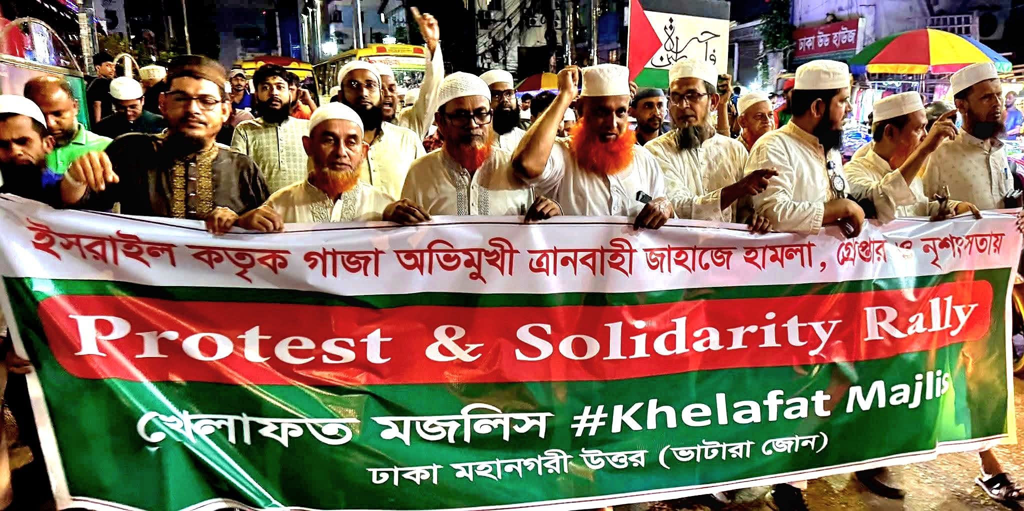 গাজাবাসীর জন্য ত্রাণবাহী সামুদ্রিক জাহাজে ইসরায়েলি বাহিনীর বাধা ও বর্বরোচিত হামলার তীব্র নিন্দা জানিয়ে রাজধানীর ভাটারায় বিক্ষোভ মিছিল ও প্রতিবাদ সমাবেশ করেছে খেলাফত মজলিস ঢাকা মহানগর উত্তর ভাটারা জোন।শুক্রবার রাতের এই কর্মসূচিতে বক্তারা বলেন, নিরীহ ফিলিস্তিনি জনগণের ওপর চলমান গণহত্যা ও অবরোধ মানবতার বিরুদ্ধে ভয়াবহ অপরাধ। ত্রাণবাহী জাহাজে হামলা চালিয়ে ইসরায়েল আবারও প্রমাণ করেছে যে তারা আন্তর্জাতিক আইন ও মানবাধিকারের কোনো তোয়াক্কা করে না।খেলাফত মজলিসের নেতারা আরও বলেন, মুসলিম বিশ্বের এক হওয়া ছাড়া ফিলিস্তিনের দুর্দশা দূর হবে না। তারা অবিলম্বে জাতিসংঘ ও আন্তর্জাতিক মহলকে কার্যকর ব্যবস্থা নেওয়ার আহ্বান জানান।এ সময় সংগঠনের নেতাকর্মীরা হাতে প্ল্যাকার্ড নিয়ে স্লোগান দেন এবং গাজাবাসীর মুক্তির দাবিতে ঐক্যবদ্ধ আন্দোলনের ঘোষণা দেন।