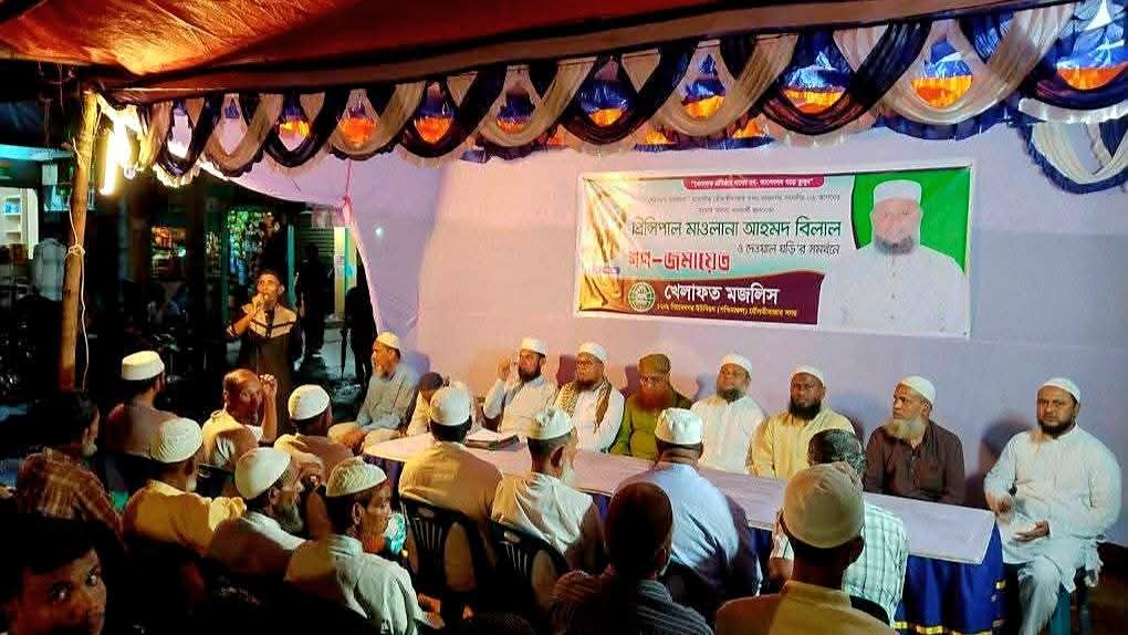 খেলাফত মজলিস মৌলভীবাজার সদর দক্ষিণের উদ্যোগে আজ সোমবার গিয়াসনগর ইউনিয়নের পশ্চিমাঞ্চলের ইমামবাজার মাঠে আয়োজিত বিশাল গণজমায়েতে মৌলভীবাজার-৩ (সদর-রাজনগর) সংসদীয় আসনে পার্টির মনোনীত প্রার্থী প্রিন্সিপাল মাওলানা আহমদ বিলাল তিনি এবং দেওয়াল ঘড়ি মার্কা সমর্থক আসনের পক্ষে উত্তাল সমর্থন পেলেন।স্থানীয় ও আশপাশের এলাকার শত শত সমর্থক, পন্থাপরায়ণ ব্যক্তি ও দলপ্রেমিক জমায়েতের আহ্বানে উত্তম উপস্থিতি নিশ্চিত করেছিলেন। সকাল থেকেই মঞ্চ সাজসজ্জা প্রস্তুত হওয়া শুরু হয়। অনুষ্ঠানবাহী সভাপতির ও স্বাগত বক্তব্যে এলাকার সমাজসেবী, ধর্মীয় নেতৃবৃন্দ, যুবদল ও মহিলা সংগঠনগুলোর প্রতিনিধিরা অংশ নেন।প্রধান বক্তৃতায় প্রিন্সিপাল মাওলানা আহমদ বিলাল বলেন, “আপনাদের আস্থা ও সমর্থন আমার জন্য দায়বদ্ধতার প্রতিশ্রুতি মাত্র। আপনাদের আশীর্বাদ ও সহযোগিতা পেলে আমি মৌলভীবাজার-৩ আসনের মানুষের সেবা ও উন্নয়নে অক্লান্ত কাজ করব।” তিনি ভোটের আগে মাঠের মানুষের সঙ্গে ঘনিষ্টভাবে কথা বলার প্রতিশ্রুতি দেন এবং কর্মসূচি, উন্নয়ন পরিকল্পনা ও ধর্মীয় শিক্ষার প্রসার নিয়ে বিস্তারিত আলোচনা করেন।অনুষ্ঠানে এলাকার বিভিন্ন সামাজিক ও ধর্মীয় সংগঠনের প্রতিনিধিরা বক্তব্য দেন। তাদের বক্তব্যে একথা উচ্চারিত হয় যে, প্রিন্সিপাল মাওলানা আহমদ বিলালকে তারা বিশ্বাস করেন ও ন্যায়পালা, ধর্মীয় ও মানবিক নীতিবোধে বিশ্বাস রাখেন। স্থানীয় রাজনৈতিক বিশ্লেষকরা বলছেন, এই ধরনের গণজমায়েত প্রার্থীর মোরালে ইতিবাচক প্রভাব ফেলবে ও ভোটারদের মনোজগতে প্রেরণা যোগাবে।জমায়েতে অংশগ্রহণকারীরা উৎসবমুখর পরিবেশে বক্তাদের বক্তব্য শোনেন, স্লোগান দেন এবং ভবিষ্যতের উন্নয়ন-মিশন ও পরিকল্পনার প্রতি আশাবাদ ব্যক্ত করেন।এমন দৃশ্যই ছিল দেখা মঞ্চ এবং জনতা মিশ্রিত হয়ে — এক মমতা ও নৈকট্যপূর্ণ রাজনৈতিক বন্ধন তৈরি করার চিহ্নরূপ।