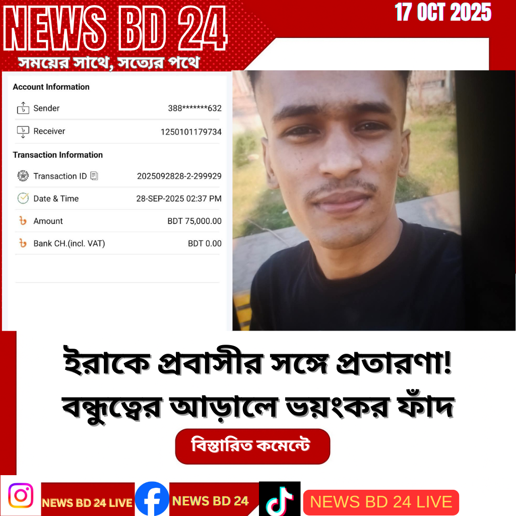 ইরাকে অবস্থানরত দিনাজপুরের যুবক মোঃ নুর সাকিবের জীবনে নেমে এসেছে এক ভয়াবহ দুঃস্বপ্ন। দীর্ঘ তিন বছর ধরে লেনদেনের সম্পর্ক থাকা এক ব্যক্তির হাতে তিনি হারিয়েছেন কষ্টার্জিত টাকা।সাকিব জানান, তিনি ইরাকে ছোট ব্যবসা পরিচালনা করতেন এবং প্রবাসী বাংলাদেশিদের বিকাশ সেবা দিতেন। এতে অনেকের উপকার হতো, কারণ অনেক সময় লোকজন অফিস থেকে বের হতে পারতেন না। তার এমন উদ্যোগে প্রবাসীদের মধ্যে আস্থা তৈরি হয়েছিল।গত ২৫ সেপ্টেম্বর (২০২৫) সন্ধ্যায় তিনি নিয়ম অনুযায়ী টাকা ছাড়তে গেলে দেখতে পান, যাকে টাকা ছাড়ার কথা, সে উধাও। স্থানীয়দের ভাষ্যমতে, ওই ব্যক্তি অফিস ছেড়ে পালিয়েছে। কেউ কেউ বলেন, সে এয়ারপোর্টের দিকেই চলে গেছে।সাকিব বলেন, “আমি ওই ছেলেটার সঙ্গে তিন বছর ধরে লেনদেন করতাম। ২৫ সেপ্টেম্বর আমি ৭৫ হাজার টাকা ছাড়ি। কিন্তু পরদিন জানতে পারি সে আর নেই। এখন আমাকে ব্লক করে দিয়েছে।”তিনি আরও জানান, প্রতারণাকারী ব্যক্তির বাড়ি সিলেটের জাফলং চা বাগানের ইসলামপুর এলাকায়। তার বাবার নাম শফিক মিয়া।নুর সাকিব অনুরোধ করেছেন, যদি কেউ ওই ব্যক্তিকে চিনে থাকেন বা এয়ারপোর্ট এলাকায় অবস্থান করে থাকেন, তাহলে যেন দ্রুত যোগাযোগ করে সহায়তা করেন।তিনি বলেন, “ভাই আমি দিনাজপুরের মানুষ, কষ্টের টাকাটা হারিয়ে নিঃস্ব হয়ে গেছি। দয়া করে কেউ যদি সাহায্য করতে পারেন, আমাকে একটু সহায়তা করুন।”এ বিষয়ে স্থানীয় বাংলাদেশি প্রবাসীরা বলেন, “বিদেশে থাকা অবস্থায় এ ধরনের প্রতারণা এখন উদ্বেগজনকভাবে বাড়ছে। টাকা লেনদেনের আগে সবাইকে সচেতন হতে হবে।”সূত্রঃ প্রবাসী নুর সাকিবের ব্যক্তিগত বিবৃতি, ইরাক (সংগ্রহ: newsbd24live টিম)