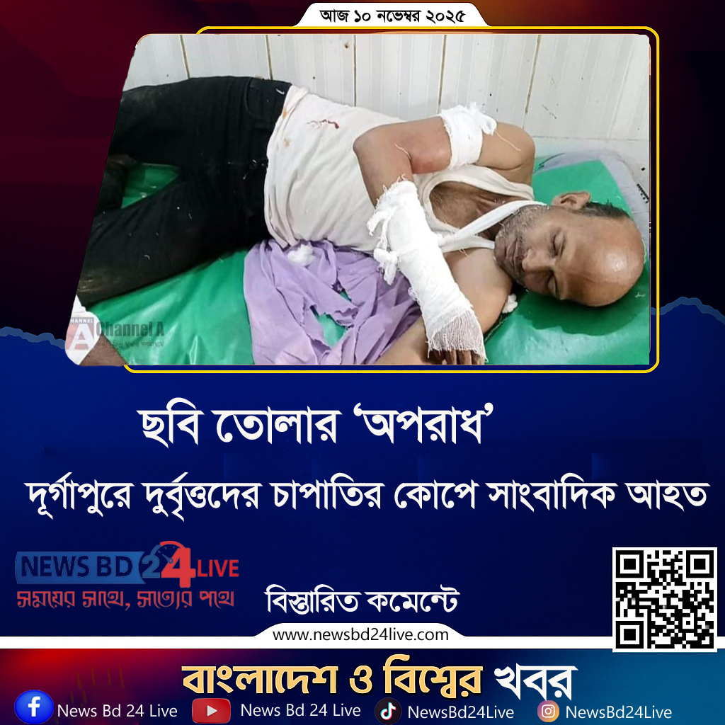 নেত্রকোনা: ১০ নভেম্বর, ২০২৫: নেত্রকোনার দুর্গাপুরে দিনের আলোয় রূপসী বাংলা টেলিভিশনের নেত্রকোনা জেলা প্রতিনিধি লুৎফুজ্জামান ফকিরকে চাপাতি দিয়ে কুপিয়ে গুরুতর আহত করেছে দুর্বৃত্তরা। সোমবার (১০ নভেম্বর) দুপুর ২টা ৪০ মিনিটের সময় সোমেশ্বরী নদীর ঘাট এলাকার কাঠের সেতুর পাশে এই বর্বরোচিত হামলার ঘটনা ঘটে।